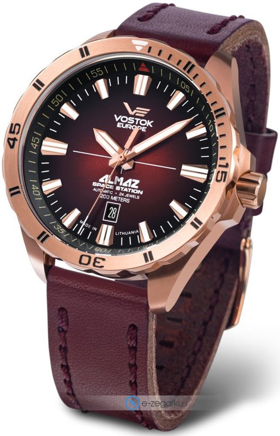 Męski zegarek NH35A-320B679 z kolekcji Vostok Europe Almaz marki Vostok Europe to połączenie smaku oraz oryginalnych mechanizmów. Charakter zapewnia wysokiej jakości tarcza w kolorze czerwonym. Aktualna godzina prezentowana jest w sposób analogowy co bez trudu pozwala ją odczytać. Koperta jest w kolorze różowo złotym szeroka jest na 47 mm oraz ma grubość 15 mm - w kształcie okrągłym.