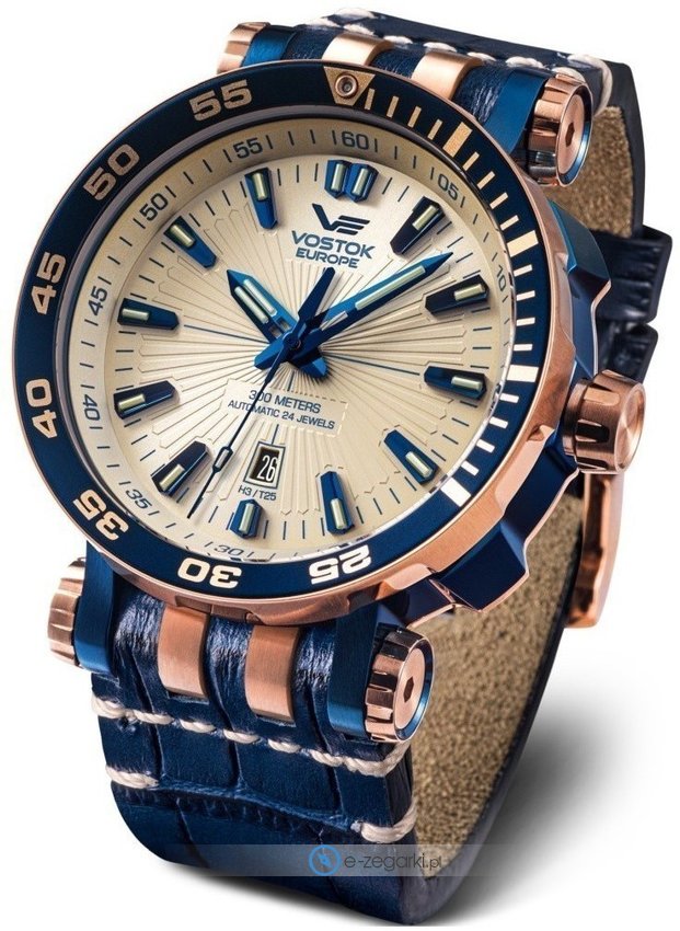 Męski zegarek NH35A-575E651 z serii Vostok Europe Energia marki Vostok Europe to połączenie estetyki i pomysłowych funkcji. Ciekawy wygląd zegarka uzyskano m.in. poprzez cyferblat w kolorze beżowym. Pokazana metodą analogową bieżąca godzina jest czytelna i szybka do odczytania. Koperta jest ozdobiona kolorem niebieskim szeroka jest na 48 mm oraz ma grubość 17 mm - charakteryzuje się okrągłym kształtem.