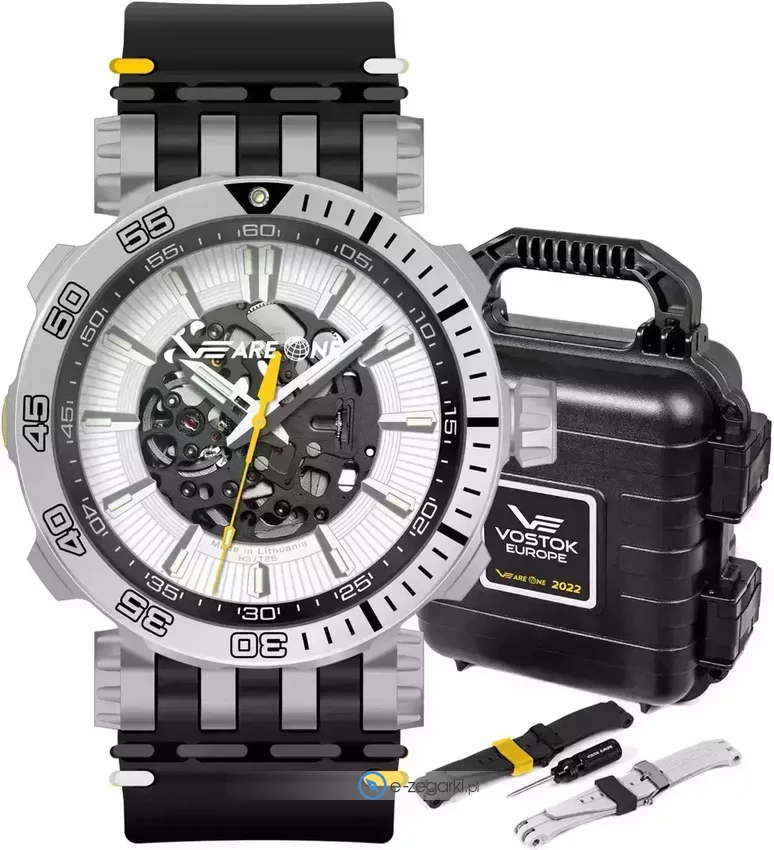 Dodatkowo model Vostok Europe NH72-575H705 VEareONE 2022 - OPTION C jest wyposażony w funkcje takie jak zawór helowy - uwalniający cząsteczki helu powstałe w wyniku podwyższonego ciśnienia oraz podświetlenie trytowe, korzystające z izotopu wodoru H3 umożliwiające podświetlenie wskazań zegarka niezależnie od innego źródła energii.