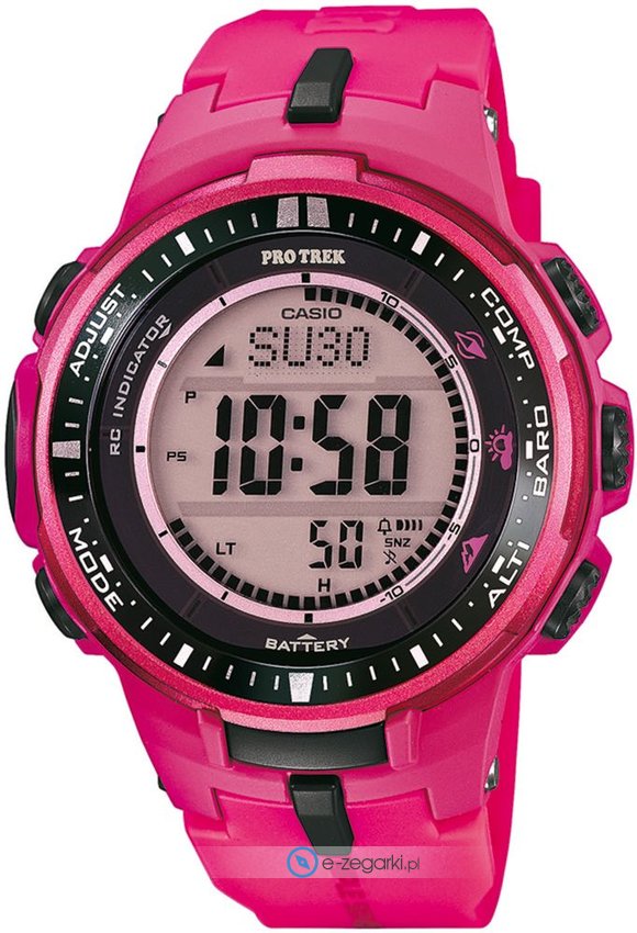 Wśród dodatkowych cech zegarka Casio PRW-3000-4BER można wymienić kompas, który dobrze sprawdza się w czasie podróży wskazując kierunki geograficzne: północ, południe, wschód, zachód, wysokościomierz pokazujący aktualną wysokość nad poziomem morza jak również barometr - który sprawdza aktualne ciśnienie atmosferyczne.