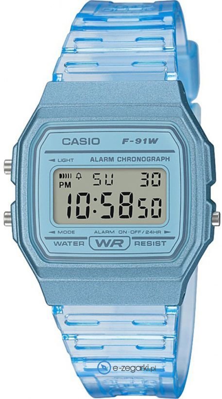 Zasilanie zegarka F-91WS-2EF to standardowa bateria kwarcowa. Pasek koloru niebieskiego wykonany jest z wysokiej jakości tworzywa sztucznego.