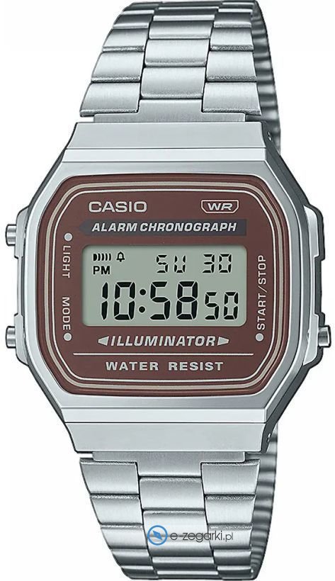 Damski zegarek A168WA-5AYES z kolekcji Casio Vintage marki Casio to połączenie smaku i oryginalnych mechanizmów. Atrakcyjną budowę czasomierza uzyskano dzięki tarczy w kolorze brązowym. Aktualna godzina pokazywana jest w sposób cyfrowy co bez trudu pozwala ją odczytać. Koperta w odcieniach koloru srebrnego szeroka jest na 35 mm oraz ma grubość 9 mm.