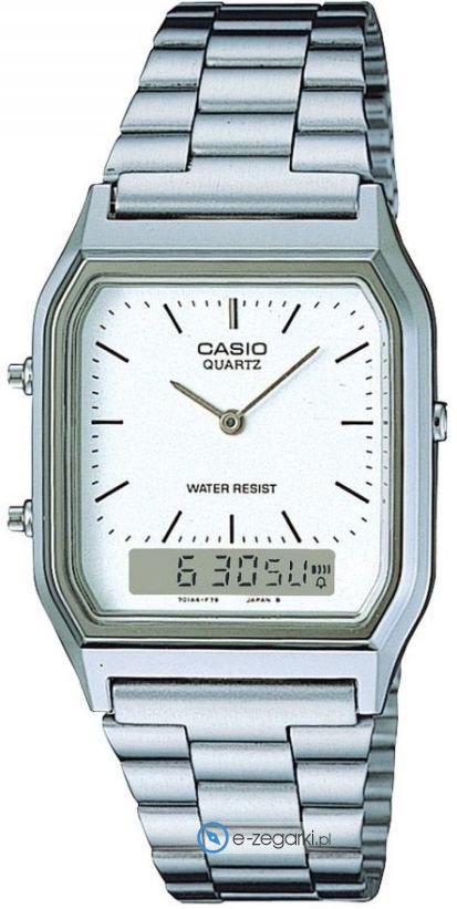 Zegarek unisex AQ-230A-7D marki Casio należy do rodziny Casio Vintage. Stylu dodaje wysokiej jakości cyferblat w kolorze białym. Zegarek ten prezentuje godzinę w formacie analogowo - cyfrowym dzięki czemu odczyt jest bardzo łatwy. Koperta została pokryta kolorem srebrnym szeroka jest na 27.8 mm oraz ma grubość 8.1 mm - posiada prostokątny kształt.