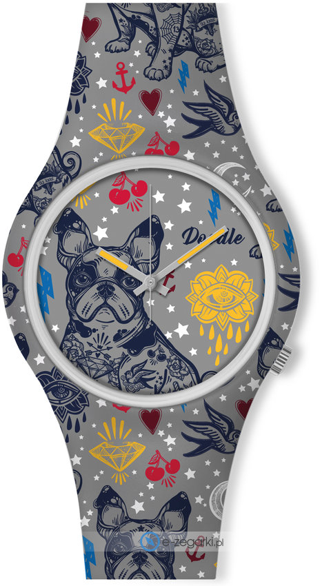 Model unisex DOAR004 marki Doodle z serii Doodle Tatoo Mood. Zegarek ten prezentuje godzinę w formacie analogowym dzięki czemu odczyt jest bardzo łatwy. Koperta szeroka jest na 39 mm oraz ma grubość 10 mm - posiada okrągły kształt.