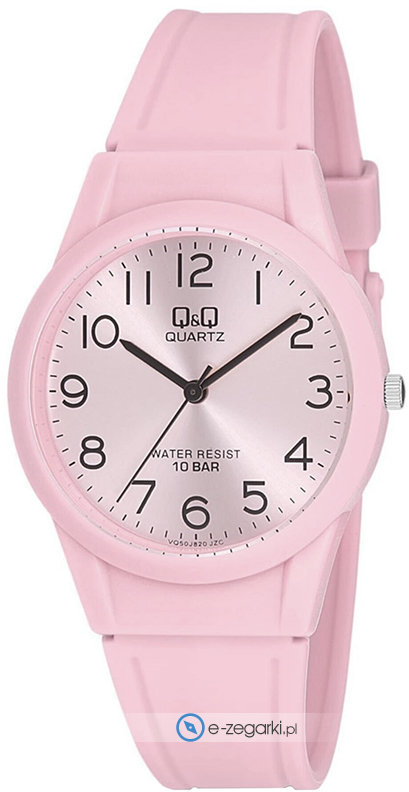 Uniwersalny zegarek Q&Q VQ50-820 to zegarek, który dzięki swemu wzornictwu zawsze będzie prezentował się dobrze. Charakterystyczny wygląd czasomierza uzyskano także dzięki tarczy w kolorze różowym. Godzina przedstawiona jest w sposób analogowy co intuicyjnie pozwala ją odczytać. Koperta została pokryta kolorem różowym szeroka jest na 38 mm oraz ma grubość 10 mm - w kształcie okrągłym.