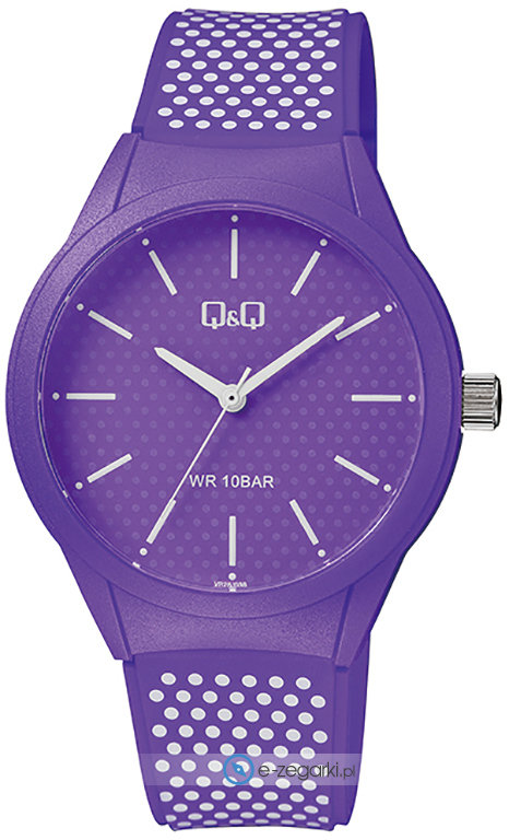 Zasilanie zegarka VR28-038 to klasyczna bateria kwarcowa. Pasek w tonacji koloru fioletowego wykonany jest z wysokiej jakości tworzywa sztucznego.